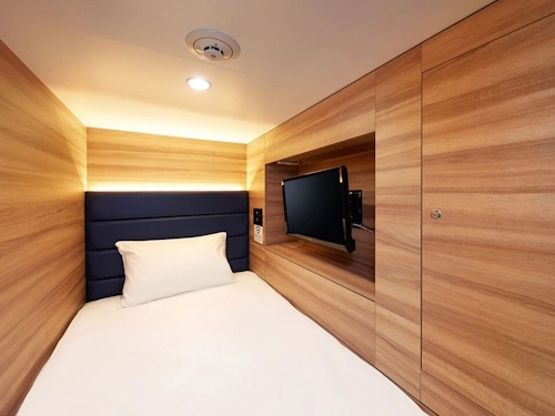 Conveniently positioned just a two-minute walk from Ichigaya Station and within easy reach of Tokyo’s Imperial Palace, First Cabin Ichigaya redefines capsule living with a sophisticated touch. Guests can choose from Classy square-style capsules offering built-in TVs, room wear, in-capsule safes, and free Wi‑Fi—all within a sleek, contemporary design. The property also includes a 24-hour front desk, laundry services, and spotless shared bathrooms with baths and toiletries, making it a refined yet practical choice for city travelers.