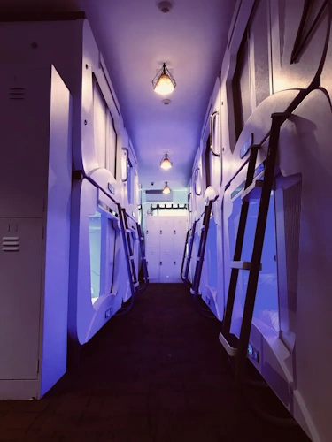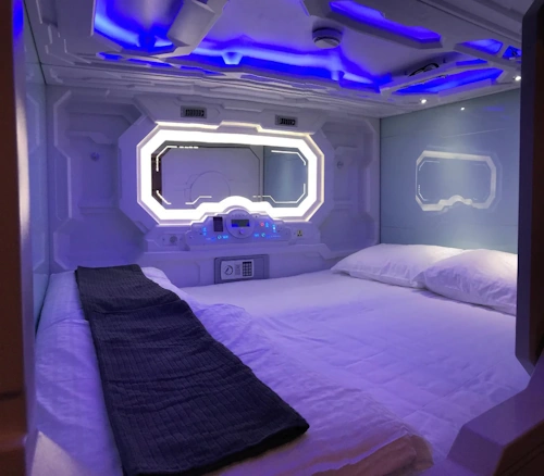 The pods themselves are the star of the show. Each capsule is designed like a mini spaceship cabin — sleek white interiors, ambient lighting, and built-in conveniences like charging ports, fold-out tables, and storage space. While compact, the design gives you a sense of privacy and control over your environment. You can adjust the lighting to suit your mood, plug in your devices to recharge, and close off your pod for a restful night’s sleep. It’s like having your own futuristic sanctuary in the middle of the city.