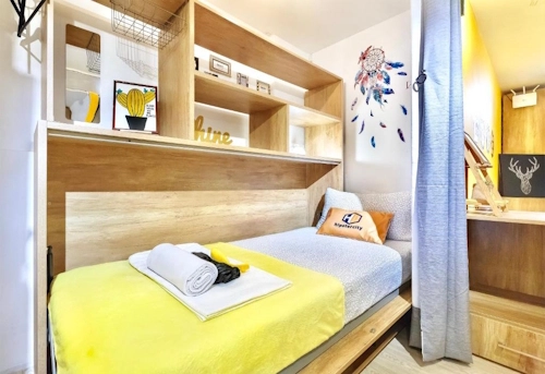 HipsterCity blends the social vibe of hostels with personal privacy. The common dorms are outfitted with bunk beds, each nestled behind individual curtains to create a personal nook. Many bunks—including double-loft options—come with personal desks, power sockets, USB ports, and even safes, making it easy to work or relax behind your own curtain.