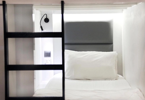 Capsule PodsSleek sleeping pods with individual lighting, ventilation, and sound-resistant walls for comfort and privacy.