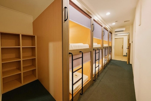 Each dorm-style capsule room comes with an ensuite bathroom, complete with bidet, shower, and complimentary toiletries. This design means that even in a shared setup, guests enjoy privacy and convenience without compromising comfort.